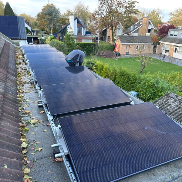 Voor de zonnepanelen kozen we voor DasSolar glas-glas panelen met 25 jaar fabrieksgarantie én vermogensgarantie. De installatie wordt aangestuurd door een SolarEdge 3-fase omvormer met optimizers, zodat elk paneel onafhankelijk presteert.